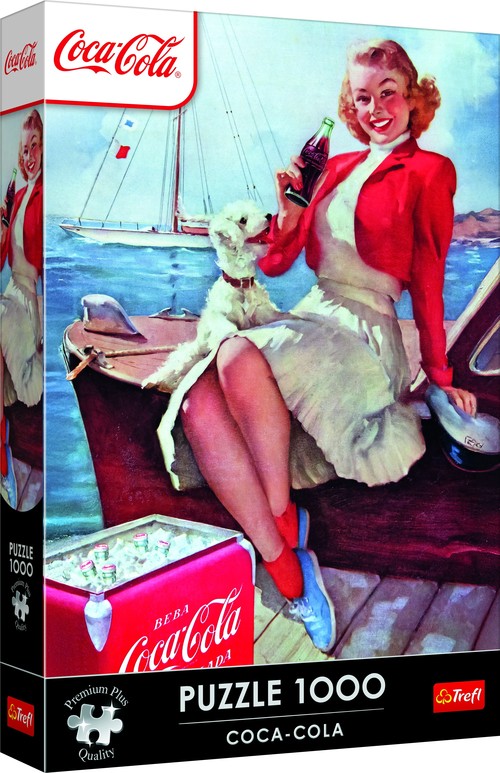 Puzzle Coca-Cola: Czas na przerwę przedstawiają uśmiechniętą dziewczynę z butelką słynnego napoju na tle jeziora. Po ich ułożeniu powstanie obraz o wymiarach 683x480 mm.