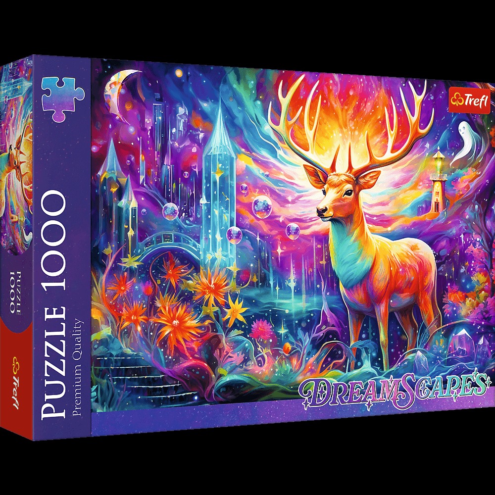 Puzzle DreamScapes: Mistyczny jeleń, składające się z 1000 elementów, przedstawiają majestatycznego jelenia na tle barwnej scenerii pełnej kwiatów i nierzeczywistych kształtów. Po ich ułożeniu powstanie obrazek w rozmiarach 683x480 mm.