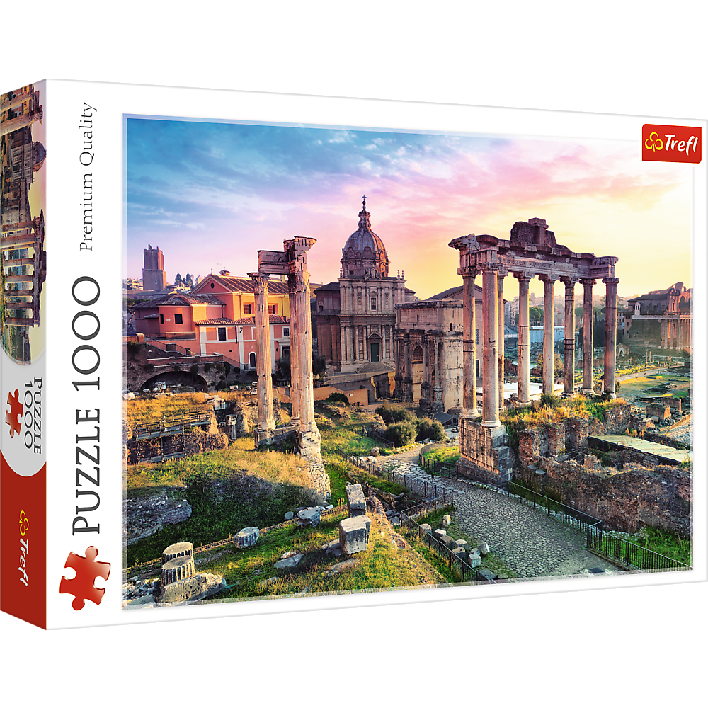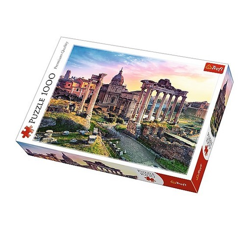 Puzzle 1000 elementów z widokiem na Forum Romanum. Po ułożeniu powstanie obrazek o wymiarach 68x48 cm. Wysoką jakość, nasycenie kolorów i bezpieczeństwo układania zapewnia kalandrowany papier odbijający światło, pokryty ekologicznymi farbami spożywczymi.