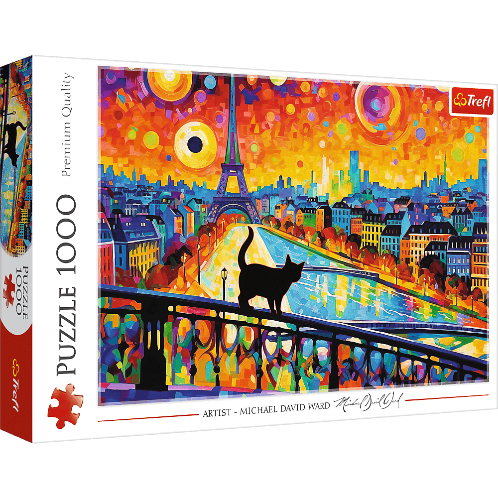 Puzzle Kot w Paryżu, składające się z 1000 elementów, przedstawiają obraz artysty Michael David Ward. Gotowa układanka ma wymiary 683x480 mm i prezentuje czarnego kota na pięknym kolorowym tle z Wieżą Eiffla i paryskimi kamienicami.