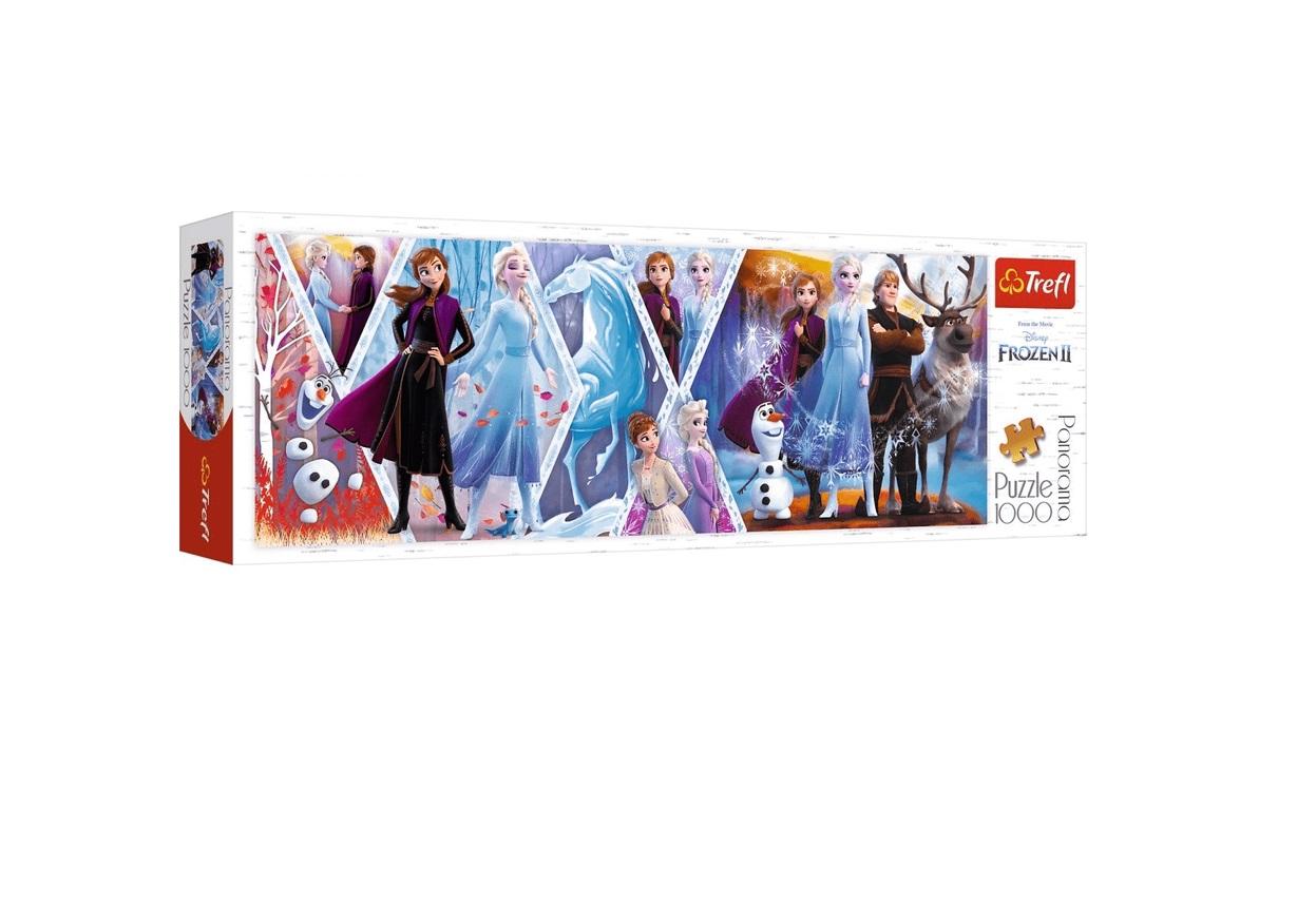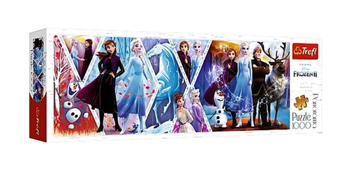 Puzzle panoramiczne składające się z 1000 elementów przedstawiające postacie filmu Kraina Lodu 2 (Frozen 2). Po ułożeniu powstanie obrazek o wymiarach 970x340mm. Produkt został wykonany z wysokiej jakości materiałów, z zastosowaniem specjalnego kalandrowanego papieru odbijającego światło, co ułatwia układanie.
