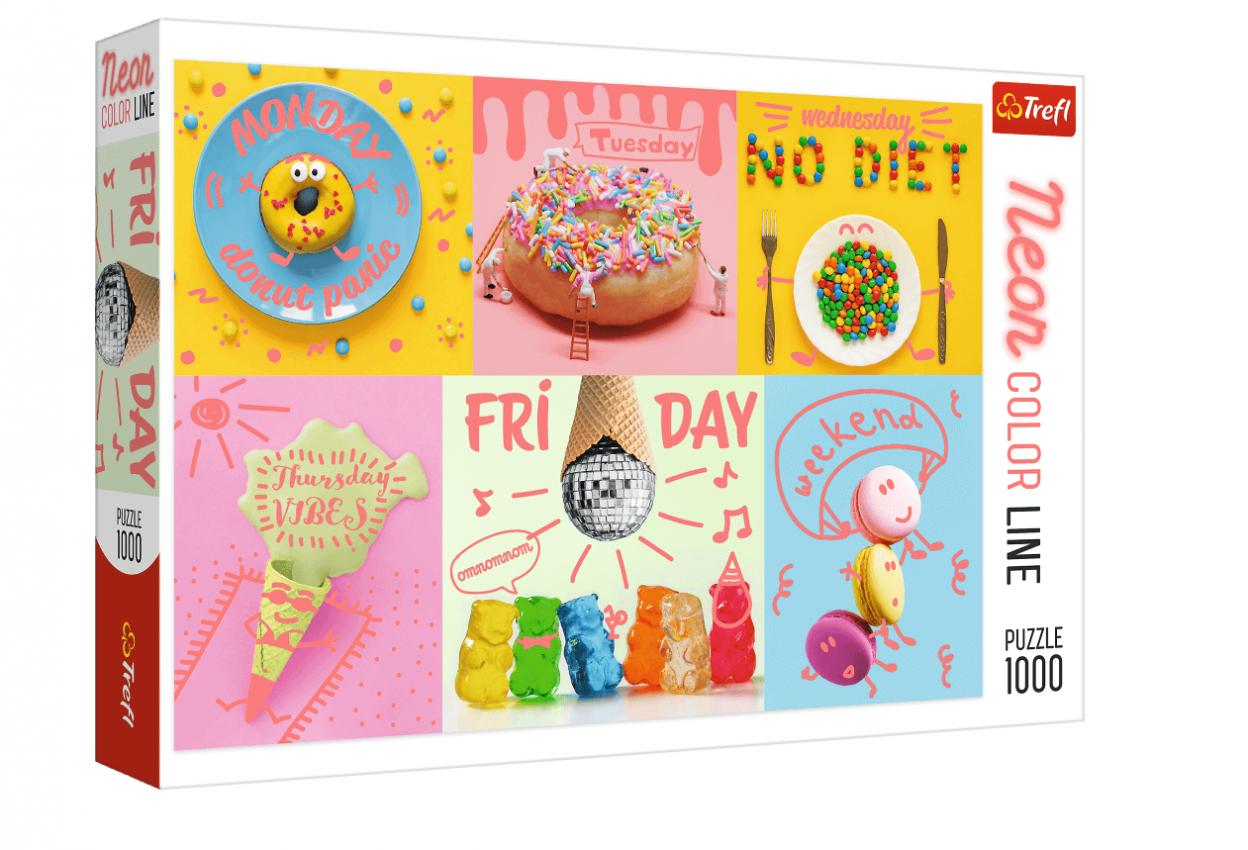 Puzzle składają się z 1000 elementów i przedstawiają apetyczne słodycze. Całość urozmaicają neonowe elementy. Po ułożeniu powstanie obrazek o wymiarach 683x480 mm.