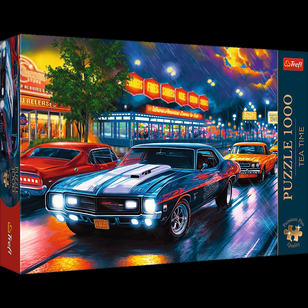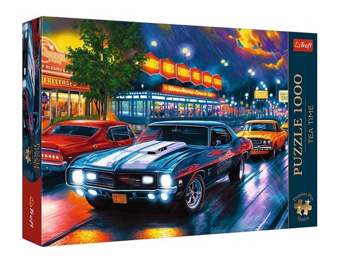 Puzzle Nocna przejażdżka przedstawiają auta jadące przez roświetlone nocnym życiem miasto. Po ich ułożeniu powstanie obraz o wymiarach 683x480 mm.