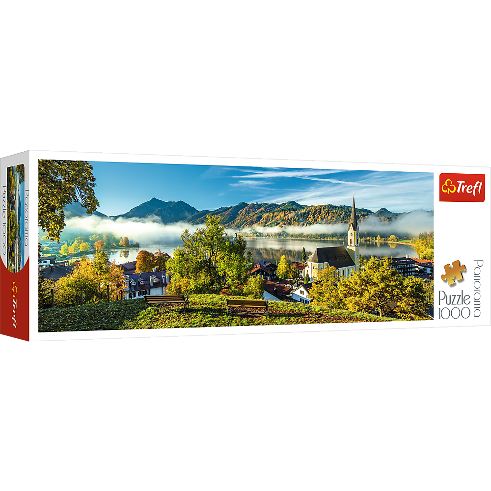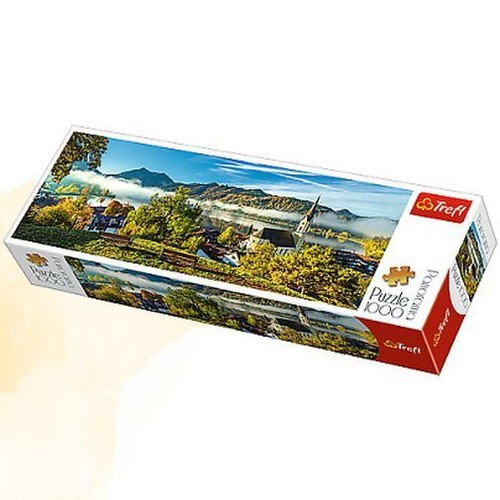 Panoramiczne puzzle 1000-elementowe ze zdjęciem przedstawiającym jezioro Schliersee. Po ułożeniu powstanie obrazek o wymiarach 97x34 cm. Wysoką jakość, nasycenie kolorów i bezpieczeństwo układania zapewnia kalandrowany papier odbijający światło, pokryty ekologicznymi farbami spożywczymi.