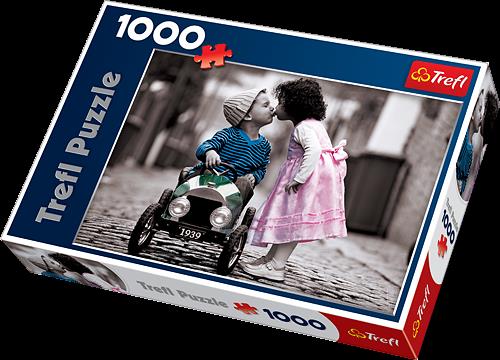 Puzzle 1000 elementów przedstawiające pierwszy pocałunek małych zakochanych. Po ułożeniu powstanie obrazek o wymiarach 68x48cm. Wysoką jakość, nasycenie kolorów i bezpieczeństwo układania zapewnia wykorzystanie materiałów ekologicznych.