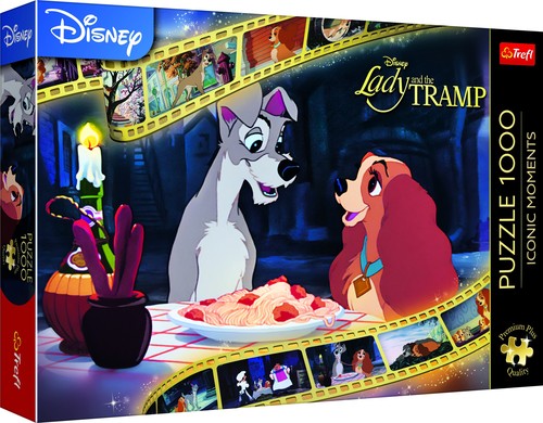 Puzzle Zakochany kundel przedstawiają niezapomniane ujęcie z bajki Disneya. Po ich ułożeniu powstanie obraz o wymiarach 683x480 mm.