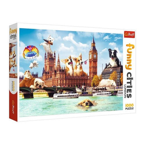 Zestaw puzzli składa się z 1000 elementów i umożliwia ułożenie przesłodkiego obrazu z uroczymi psiakami w londyńskim klimacie!