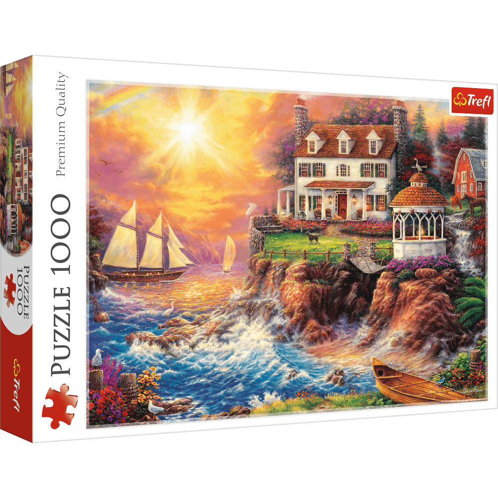 Puzzle składające się z 1000 elementów przedstawiające widok na morską przystań. Po ułożeniu powstanie obrazek o wymiarach 683x480 mm.