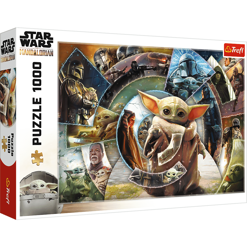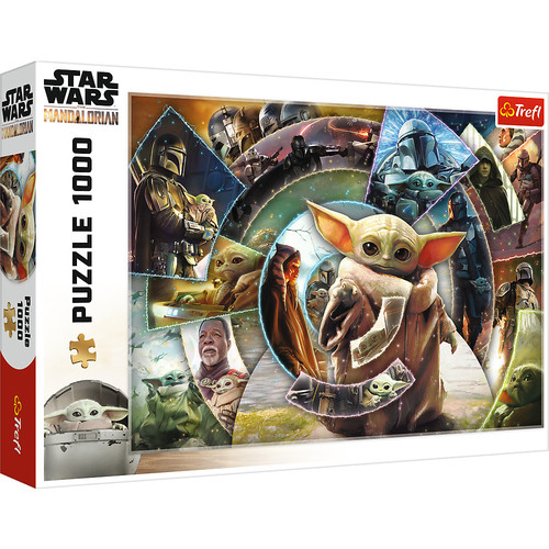 Puzzle Podróż Grogu, składające się z 1000 elementów, przedstawiają nietuzinkowy kolaż z bohaterami serialu The Mandalorian. Po ich ułożeniu powstanie obrazek w rozmiarach 683x480 mm.