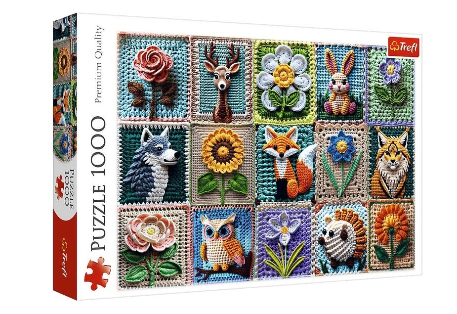 Puzzle Szydełkowanie - moja pasja, składające się z 1000 elementów, przedstawiają kolaż ze zwierzętami i kwiatami zrobionych metodą szydełkową. Po ich ułożeniu powstanie obrazek w rozmiarach 683x480 mm.