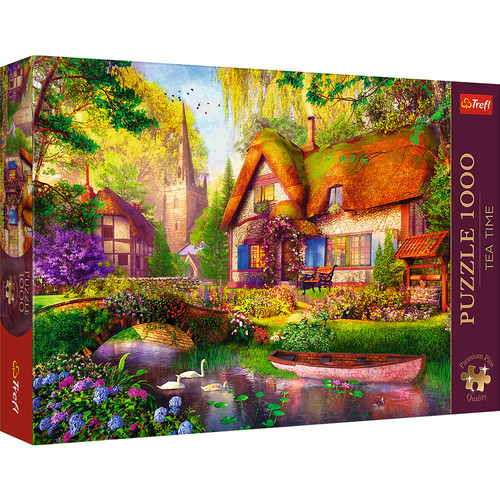 Puzzle Urocza chatka w lesie przedstawiają zachwycający dom położony nad rzeczką. Po ich ułożeniu powstanie obraz o wymiarach 683x480 mm.