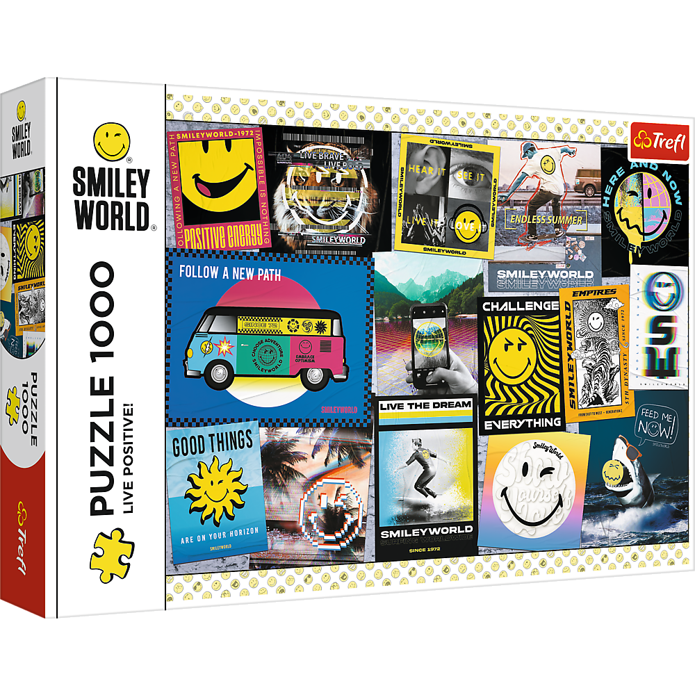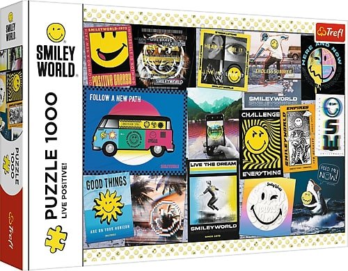Żyj pozytywnie! - puzzle 1000 elementów to wspaniała układanka z serii Smiley World. Puzzle przedstawiają symbol szerokiego uśmiechu, który został uwieczniony na fotografiach i plakatach. Po ułożeniu powstanie obraz o wymiarach: 683 x 480 mm.