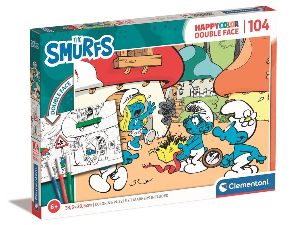 Wyjątkowa kolekcja Smerfy 104 elementy. Nowa linia puzzli dwustronnych 104 elementy. Obrazek kolorowy z jednej strony, z drugiej czarno-biały do pokolorowania. 3 flamastry w zestawie. Wiek: +6