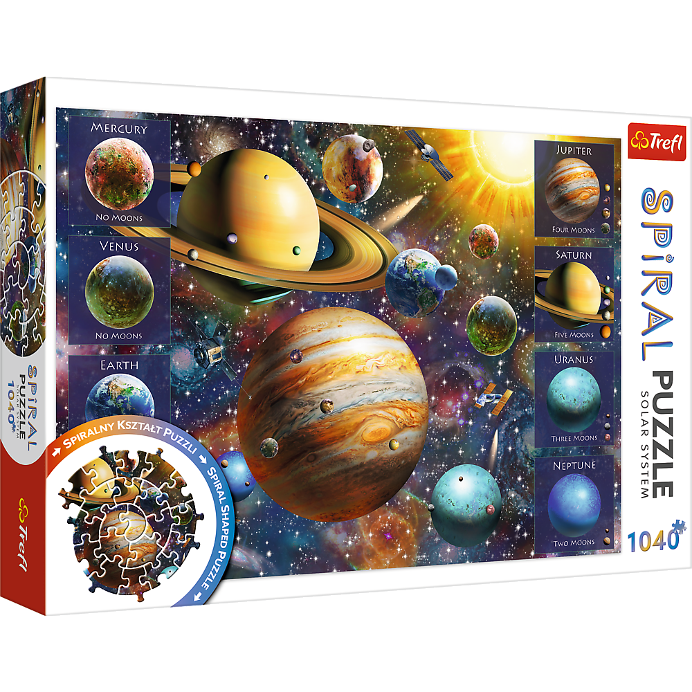 Spiral Puzzle to seria zakręconych obrazów, których elementy po ułożeniu tworzą spiralny kształt. Wskocz w wir dobrej zabawy. Podejmij wyzwanie i wkręć się w układanie 1040 elementowe puzzle przedstawiają Układ Słoneczny. Po ułożeniu powstanie obrazek o wymiarach 683x480 mm.