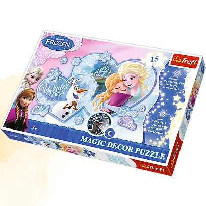 MAGIC DECOR to duże, świecące w ciemności puzzle, którymi można również ozdobić pokój dziecka! Zastosowanie specjalnej techniki, sprawia, że układanka wystawiona na promienie słoneczne lub sztuczne światło będzie świeciła w ciemności! Po ułożeniu powstanie obrazek o wymiarach 60x40 cm z bohaterami filmu ""Kraina Lodu"". W skład produktu wchodzą: puzzle 15-elementowe, ramka pocięta na puzzle z dodatkowymi wyciskanymi elementami do zakomponowania.