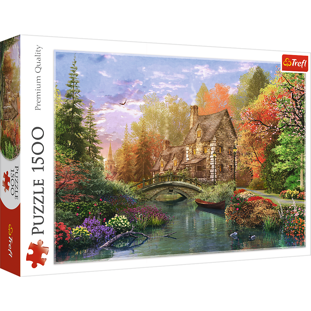 Chatka nad jeziorem Puzzle 1500 elementów z malowniczym obrazem chatki nad wodą. Po ułożeniu powstanie obrazek o wymiarach 85x58 cm. Wysoką jakość, nasycenie kolorów i bezpieczeństwo układania zapewnia wykorzystanie materiałów ekologicznych.