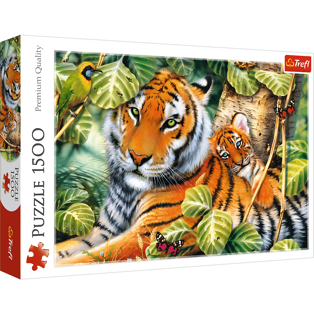 Puzzle 1500 elementów z przedstawiające dwa tygrysy, zaprojektowane z myślą o wielbicielach dzikich zwierząt. Po ułożeniu powstanie obrazek o wymiarach 850 x 580 mm. Wysoką jakość, nasycenie kolorów i bezpieczeństwo układania zapewnia wykorzystanie materiałów ekologicznych.