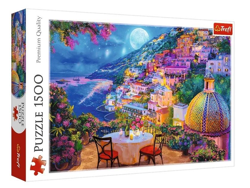 Puzzle Randka w Positano składają się z 1500 elementów i przedstawiają widok na nadmorskie miasto w świetle księżyca. Po ich ułożeniu powstanie obrazek o wymiarach 850x580 mm.