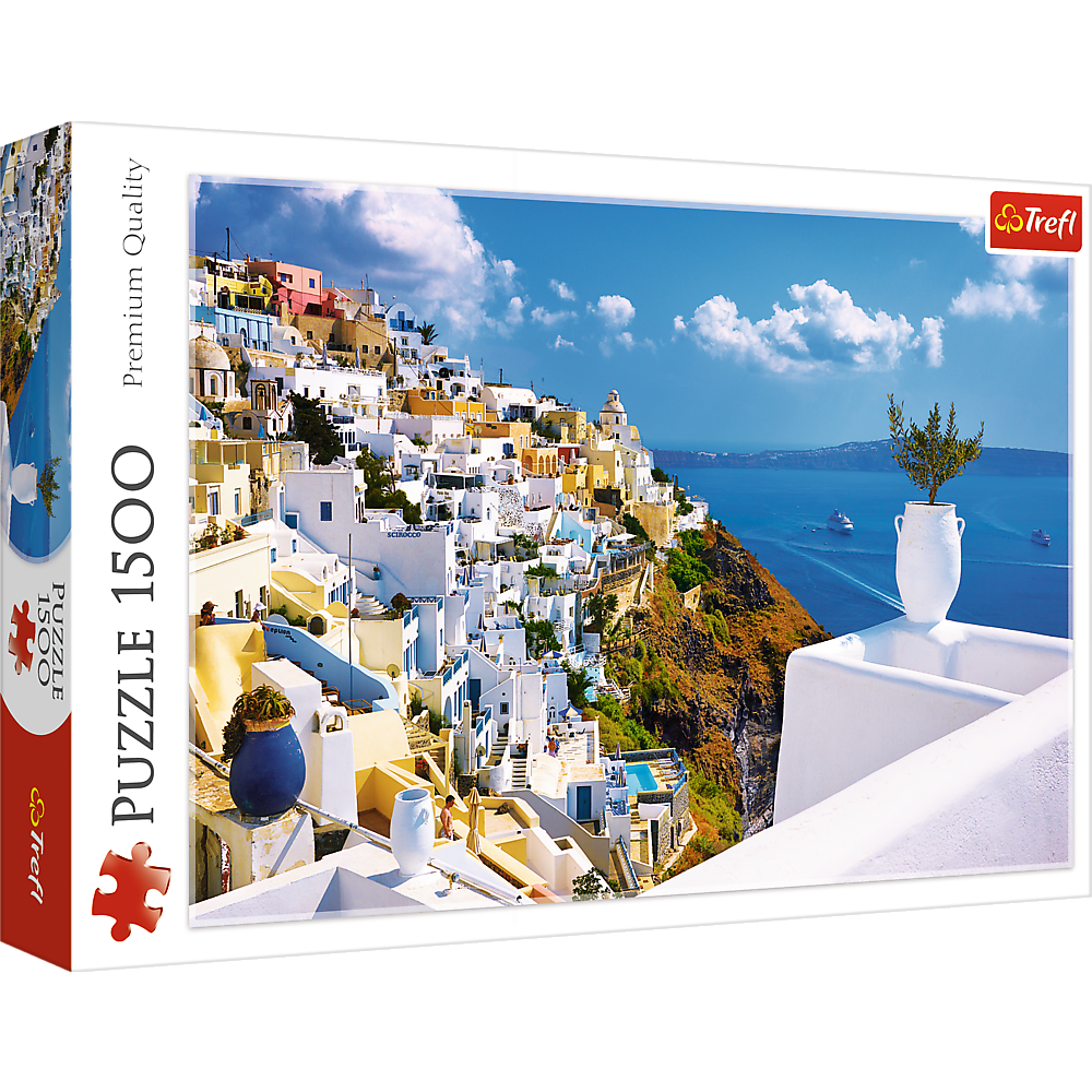 Puzzle 1500 elementów z widokiem na greckie Santorini. Po ułożeniu powstanie obrazek o wymiarach 85x58cm. Wysoką jakość, nasycenie kolorów i bezpieczeństwo układania zapewnia wykorzystanie materiałów ekologicznych.