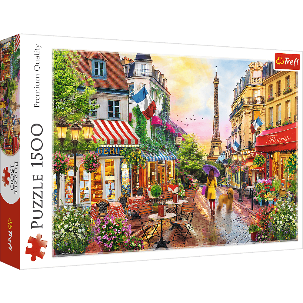 Puzzle 1500 elementów z przedstawiające malowany widok na jedną z ulic Paryża. Po ułożeniu powstanie obrazek o wymiarach 850 x 580 mm. Wysoką jakość, nasycenie kolorów i bezpieczeństwo układania zapewnia wykorzystanie materiałów ekologicznych.