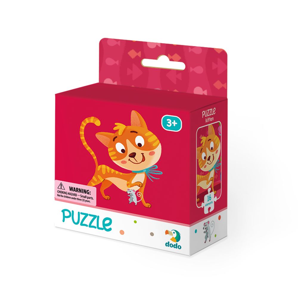 To niesamowita zabawa dla najmłodszych, która rozwija u nich małą motorykę oraz poprawia koncentrację. Puzzle z tej serii cechuje sympatyczna i przyjemna stylistyka, która zachęca dziecko do ich złożenia. W tym zestawie na obrazku znajdziemy uroczego kotka. Cała seria zawiera aż 8 obrazków przedstawiających zwierzęta: kaczuszkę, konika, kotka, lwa, małpkę, pieska, słonika i żyrafę. Wiek: 3+, Ilość elementów: 16