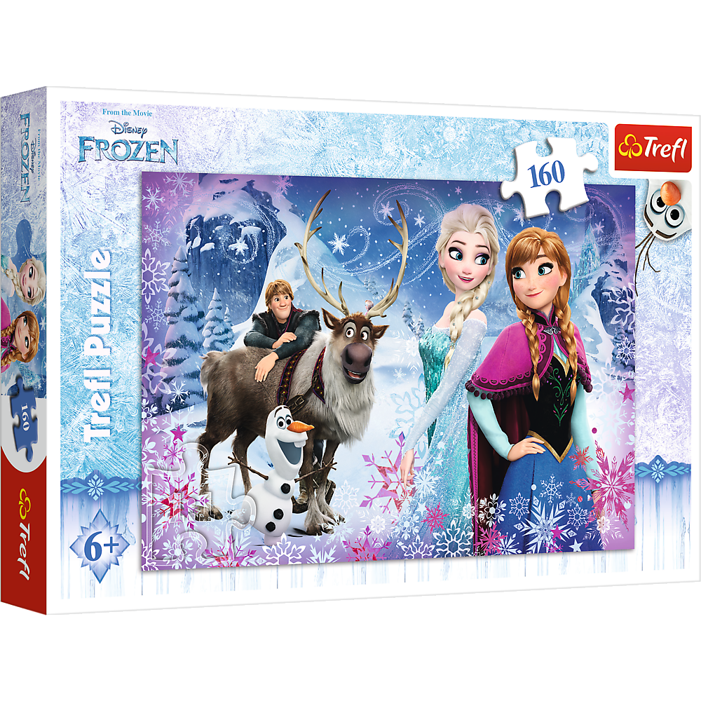 Puzzle 160 elementów z filmu Kraina Lodu. Po ułożeniu powstanie obrazek o wymiarach 41x27,8cm. Wysoką jakość, nasycenie kolorów i bezpieczeństwo układania zapewnia wykorzystanie materiałów ekologicznych.
