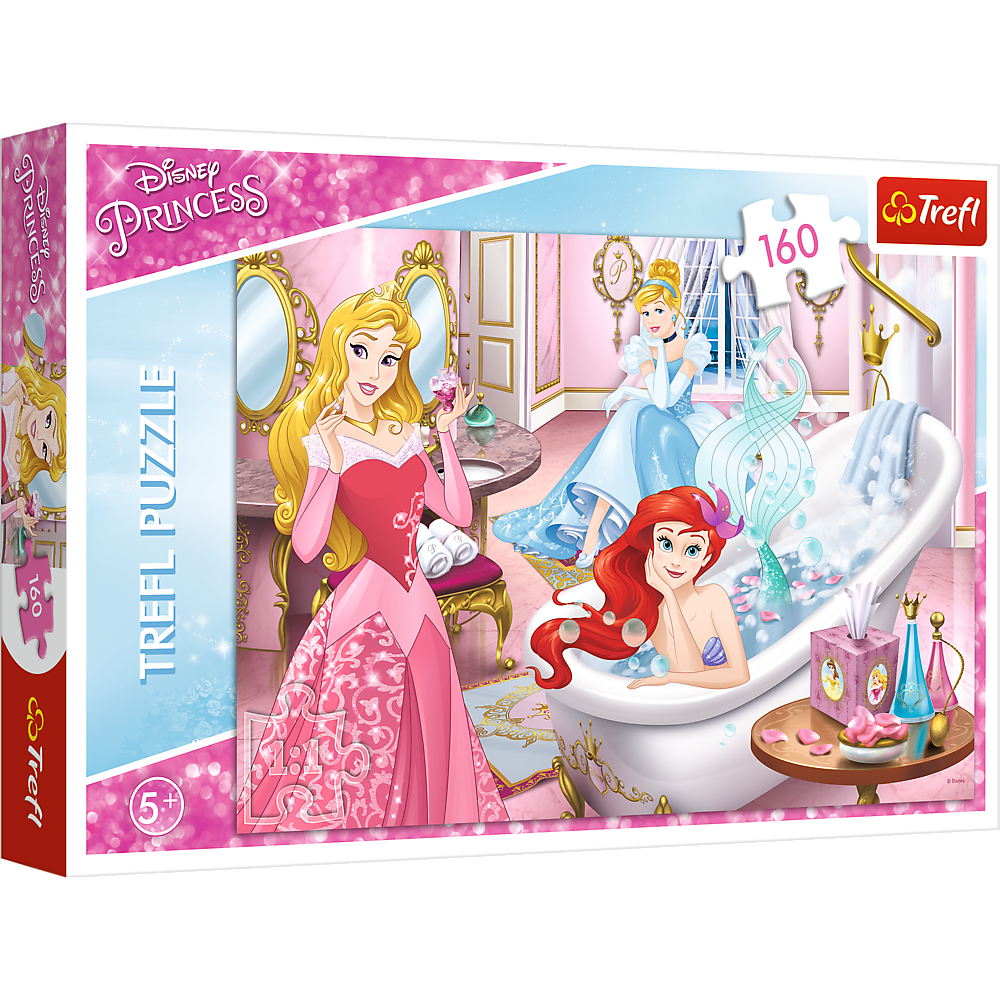 Puzzle 160 elementów z księżniczkami Disneya szykującymi się do wielkiego balu. Po ułożeniu powstanie obrazek o wymiarach 41x27,8 cm. Wysoką jakość, nasycenie kolorów i bezpieczeństwo układania zapewnia kalandrowany papier odbijający światło, pokryty ekologicznymi farbami spożywczymi. Puzzle oparte na licencji Disney Princess.