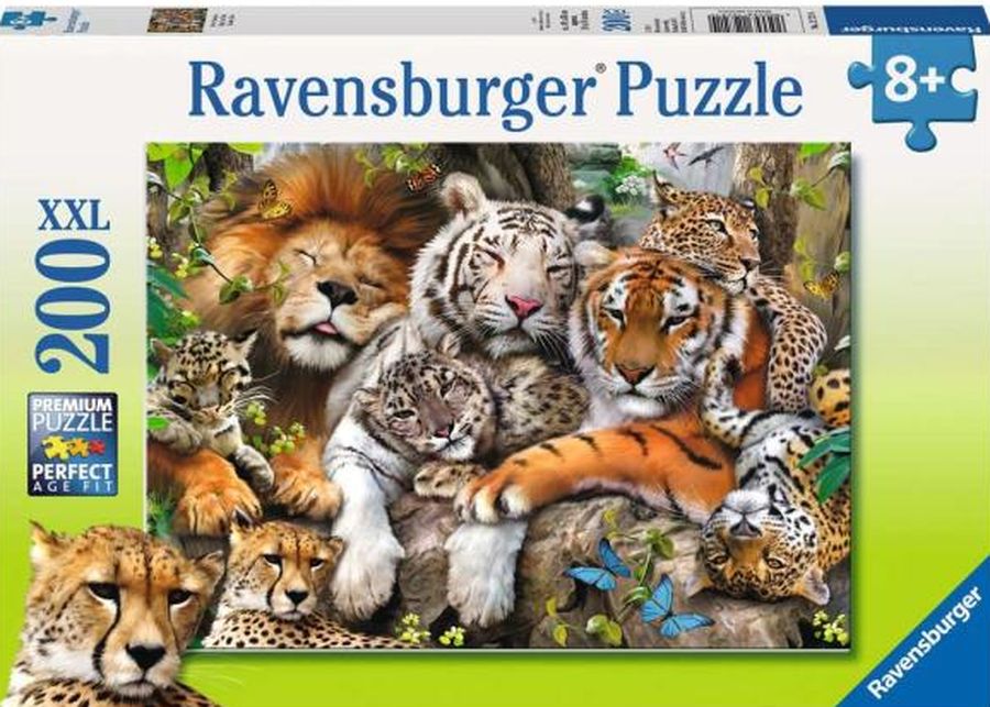 Puzzle XXL 200 elementów Ravensburger to składająca się ze 200 elementów układanka przedstawiająca tygrysy