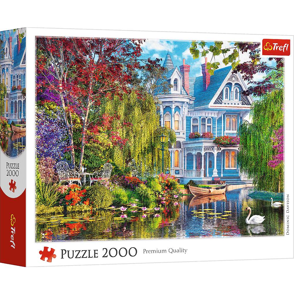 Puzzle Dom nad jeziorem składające się z 2000 elementów przedstawiają malowniczą rezydencję położoną nad spokojnym jeziorem, otoczoną bujną zielenią, kolorowymi kwiatami i drzewami.