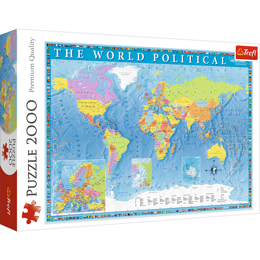 Puzzle 2000 elementów z polityczną mapą świata. Puzzle spełniają dwie funkcje - rozrywkową oraz edukacyjną. Ułożony obrazek może być świetną pomocą naukową, a dodatkowo dobrze sprawdzi się jako ozdoba ściany w pokoju dziecka. Po ułożeniu powstanie obrazek o wymiarach 96x68 cm. Wysoką jakość, nasycenie kolorów i bezpieczeństwo układania zapewnia kalandrowany papier odbijający światło, pokryty ekologicznymi farbami spożywczymi.