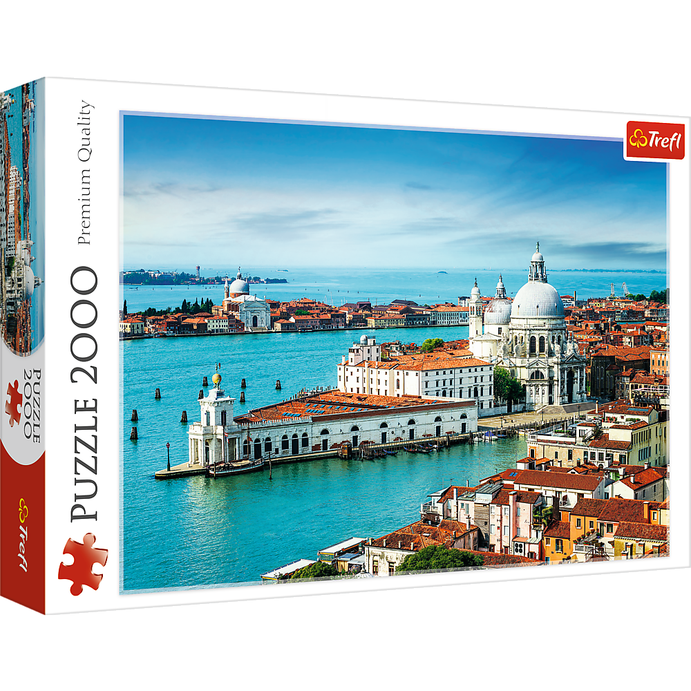 Puzzle 2000 elementów z widokiem na Bazylikę Santa Maria della Salute w Wenecji. Po ułożeniu powstanie obrazek o wymiarach 96x68 cm. Wysoką jakość, nasycenie kolorów i bezpieczeństwo układania zapewnia kalandrowany papier odbijający światło, pokryty ekologicznymi farbami spożywczymi..