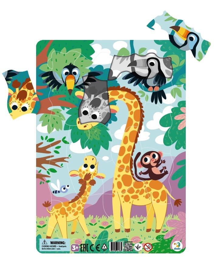 Puzzle Ramkowe DODO Żyrafy 21 elementów. Puzzle ramkowe to wspaniała zabawa dla najmłodszych. Układanka składa się z 21 elementów, umieszczonych w ramce. Ramka ułatwia młodszym dzieciom ułożenie obrazka i daje możliwość przenoszenia stworzonej układanki. Układanka uczy rozpoznawania kolorów, działa na wyobraźnię, rozwija spostrzegawczość i dostarcza wiedzy z różnych dziedzin życia.