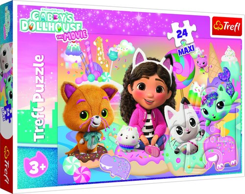 Koci świat Gabby to puzzle dla maluchów, składające się z 24 bardzo dużych elementów. Zostały zaprojektowane z myślą o małych fanach bajki Gabby's Dollhouse. Po ułożeniu układanki powstanie duży obrazek o wymiarach 600x400 mm.