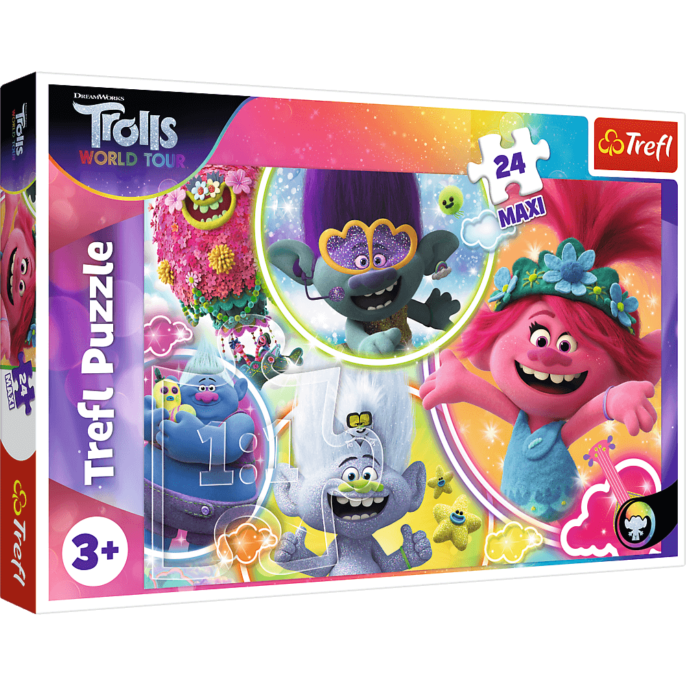 Muzyczny świat Troli to puzzle 24 maxi składające się z bardzo dużych elementów, zaprojektowaną z myślą o wszystkich fanach i fankach filmu Troli (Trolls World Tour). Po ułożeniu układanki powstanie duży obrazek, o wymiarach 600x400mm.
