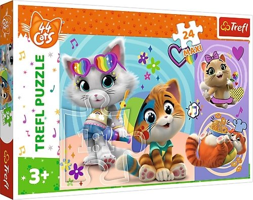 Wesołe kotki to puzzle składające się z 24 elementów, zaprojektowane z myślą o fanach kultowej bajki Rainbow 44 Cats. Po ułożeniu powstanie obrazek o wymiarach 600 x 400 mm.