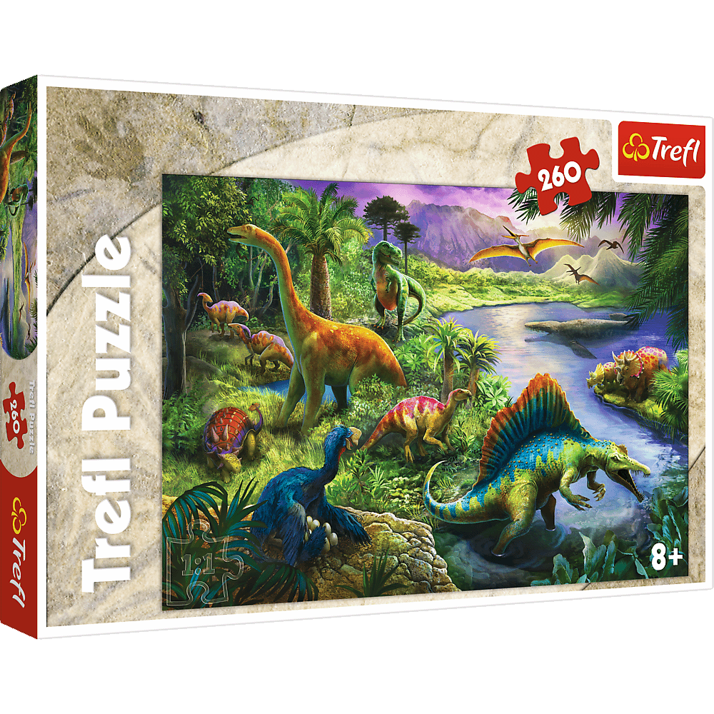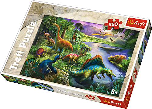 Puzzle 260 elementów z prehistirycznymi gadami. Po ułożeniu powstanie obrazek o wymiarach 60x40 cm. Wysoką jakość, nasycenie kolorów i bezpieczeństwo układania zapewnia wykorzystanie materiałów ekologicznych.