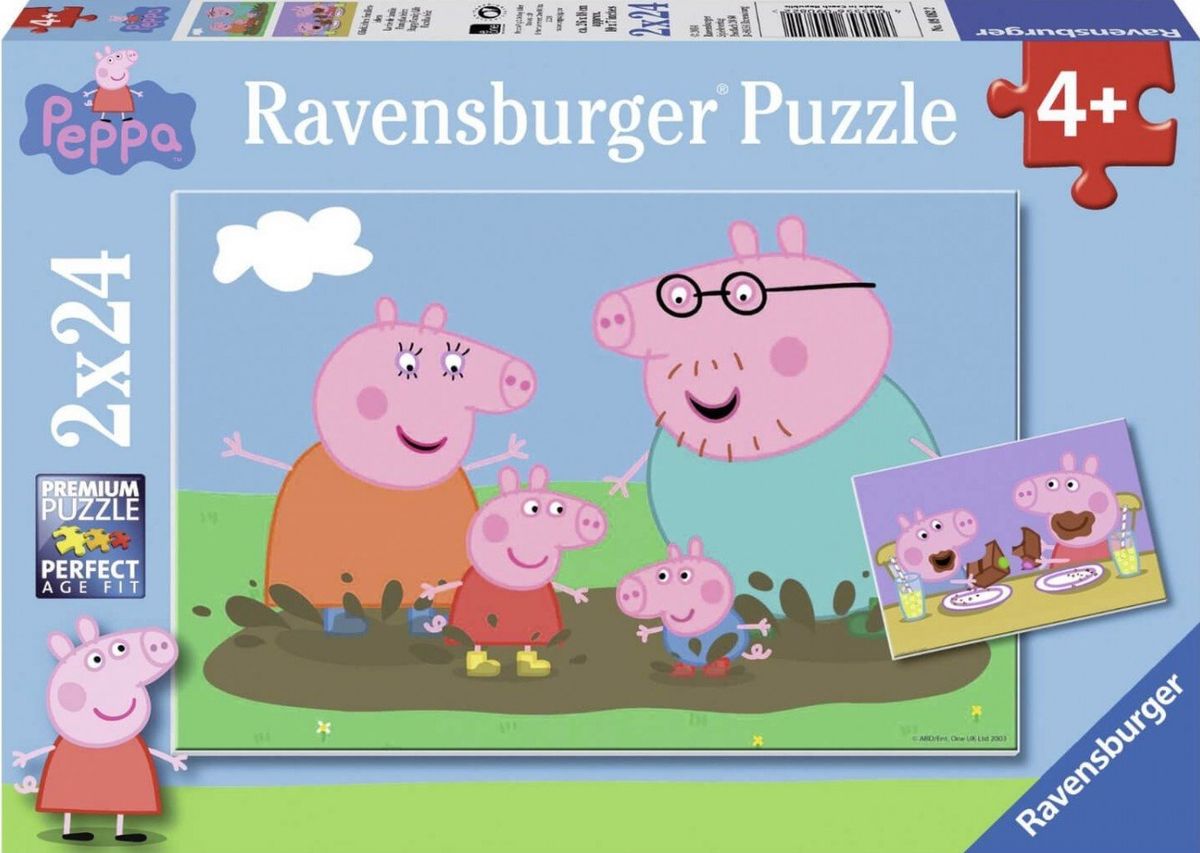 Puzzle 2x24 elementów Ravensburger składają się z 2 układanek po 24 elementy przedstawiających Świnkę Peppę bawiącą się w błocie.