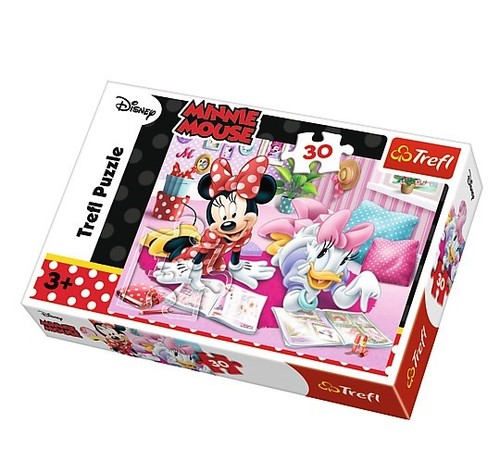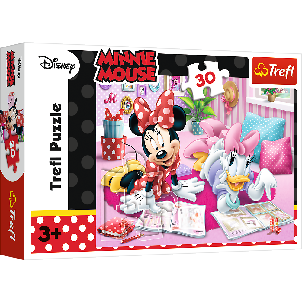 Puzzle 30 elementów z bohaterkami Minnie Mouse Disneya. Po ułożeniu powstanie obrazek o wymiarach 27x20 cm. Wysoką jakość, nasycenie kolorów i bezpieczeństwo układania zapewnia kalandrowany papier odbijający światło, pokryty ekologicznymi farbami spożywczymi.