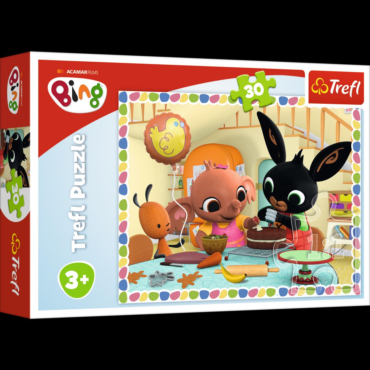 Puzzle 30 elementów z bohaterami filmu animowanego pt. "Bing". Po ułożeniu powstanie obrazek o wymiarach 200x270mm. Wysoką jakość, nasycenie kolorów i bezpieczeństwo układania zapewnia wykorzystanie materiałów ekologicznych.
