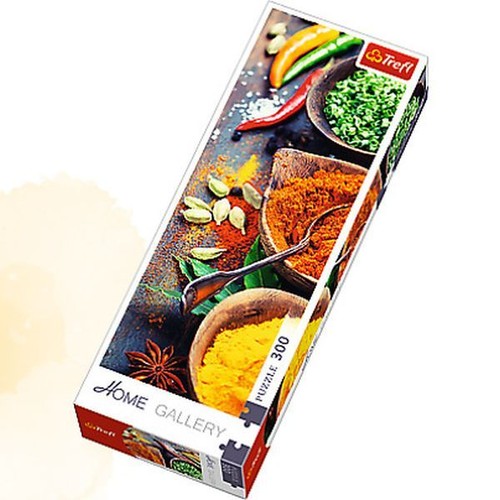 Puzzle 300 elementów przedstawiające kolorowe przyprawy. Po ułożeniu powstanie obrazek o wymiarach 16x48 cm. Wysoką jakość, nasycenie kolorów i bezpieczeństwo układania zapewnia kalandrowany papier odbijający światło, pokryty ekologicznymi farbami spożywczymi.