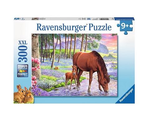 Urocze puzzle z wizerunkiem koni na tle lasu i zachodzącego słońca. Duże elementy ułatwiają układanie, a piękne kolory przyciągają uwagę dziecka.