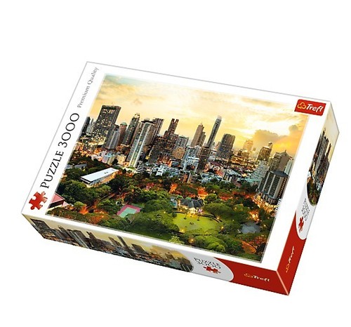 Puzzle 3000 elementów z widokiem na zachód słońca w Bangkoku. Po ułożeniu powstanie obrazek o wymiarach 116x85cm. Wysoką jakość, nasycenie kolorów i bezpieczeństwo układania zapewnia kalandrowany papier odbijający światło, pokryty ekologicznymi farbami spożywczymi.