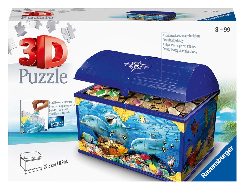Puzzle 3D Ravensburger to innowacyjna forma układanki, która zachwyci każdą dziewczynkę. Zestaw składa się z 216 plastikowych elementów, które łącząc się ze sobą tworzą mocną i solidną konstrukcję. Z trójwymiarowych puzzli powstanie ozdobna szkatułka dla dziecięcych skarbów. Dziewczynki zmieszczą w niej biżuterię, gumki i spinki do włosów oraz małe drobiazgi. Skrzyneczka z puzzli tętni życiem kolorowa grafika z podwodnymi zwierzętami i roślinami przykuwa wzrok. Puzzle 3D Ravensburger są łatwe w czyszczeniu w razie zabrudzeń wystarczy przetrzeć model wilgotną szmatką. To idealna alternatywa dla modeli do sklejania szkatułka z puzzli powstanie bez użycia kleju!