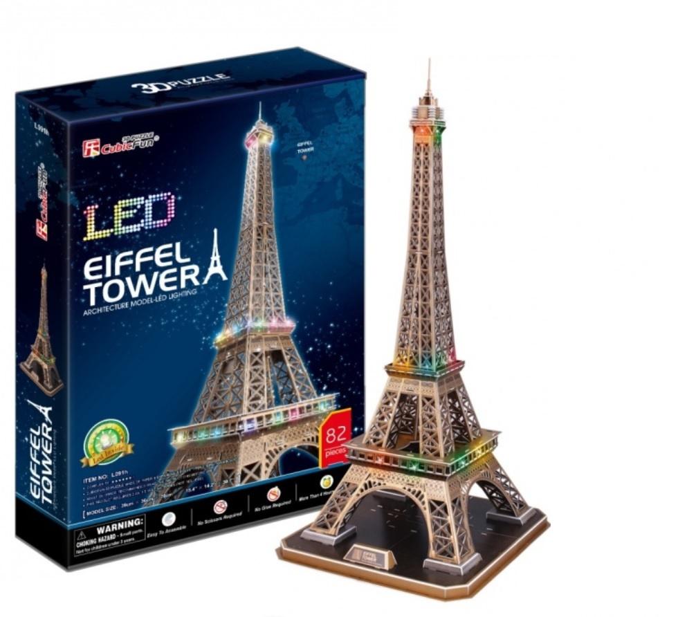 PUZZLE 3D LED WIEŻA EIFFEL'A, to pasjonująca zabawa dla dzieci oraz kolekcjonerów architektury z różnych stron świata. W opakowaniu znajduje się 82 EL. puzzli, wykonanych ze specjalnego materiału przypominającego piankę. Puzzle są ponumerowane, ponacinane i umieszczone na arkuszach. Wystarczy bez użycia siły wycisnąć element z arkusza i zmontować go zgodnie z dołączoną instrukcją, bez użycia kleju ani specjalnych narzędzi. Gotową budowlę stawia się na podstawce, w której znajdują się diody LED. Tak podświetlona budowla z puzzli 3D, przy zgaszonym świetle prezentuje się fenomenalnie. Wielkość budowli po złożeniu 39 x 36 x 78 cm. Zalecany wiek dziecka 7+.