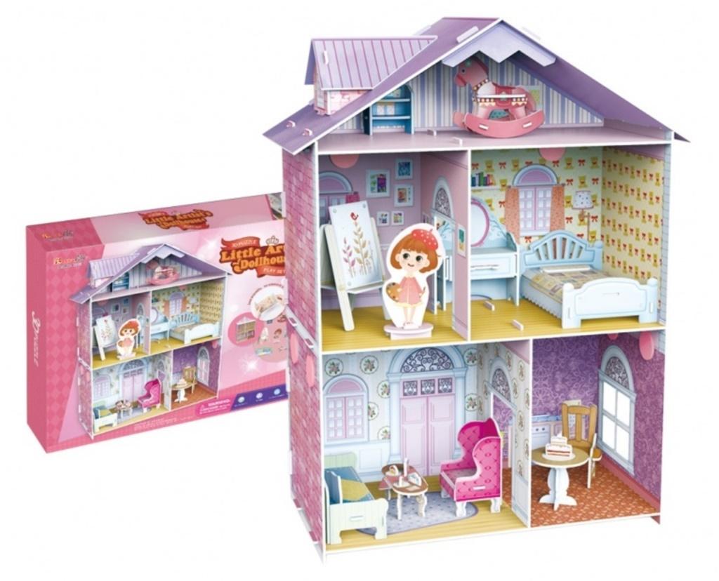 PUZZLE 3D DOMEK DLA LALEK LITTLE ARTIST'S - ZESTAW XL, to pasjonująca zabawa dla dziewczynek, które uwielbiają bawić się domkami dla lelek. W opakowaniu znajduje się 60 EL. puzzli, wykonanych ze specjalnego materiału przypominającego piankę. Puzzle są ponumerowane, ponacinane i umieszczone na arkuszach. Wystarczy bez użycia siły wycisnąć element z arkusza i zmontować go zgodnie z dołączoną instrukcją, bez użycia kleju ani specjalnych narzędzi. Wielkość domka po złożeniu 45 x 21.5 x 58 cm. Zalecany wiek dziecka 8+.