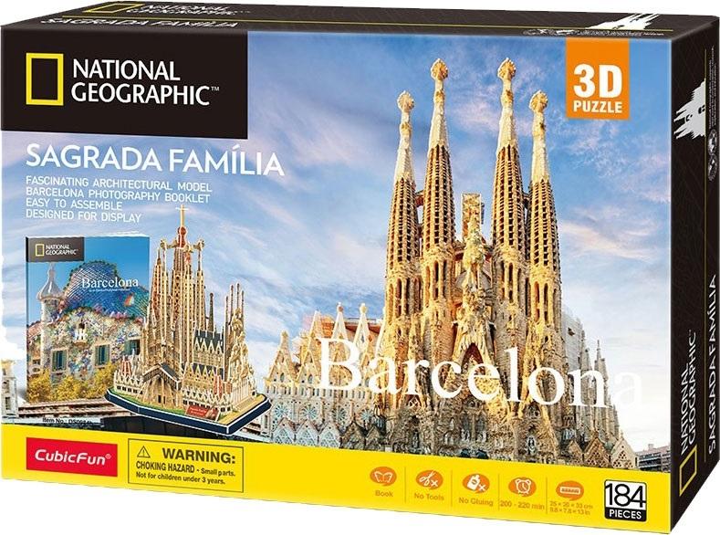 Puzzle 3D przedstawiające Sagradę Familię na licencji National Geographic. W opakowaniu znajdują się 184 puzzle, wykonanych ze specjalnego materiału przypominającego piankę. Puzzle są ponumerowane, ponacinane i umieszczone na arkuszach. Wystarczy bez użycia siły wycisnąć element z arkusza i zmontować go zgodnie z dołączoną instrukcją, bez użycia kleju ani specjalnych narzędzi. Wielkość budowli po złożeniu 25 x 20 x 33 cm. Poza puzzlami w opakowaniu znajduje się praktyczny przewodnik z ciekawostkami dotyczącymi Barcelony. Ułożenie całej budowli zajmie około 200-220 minut.