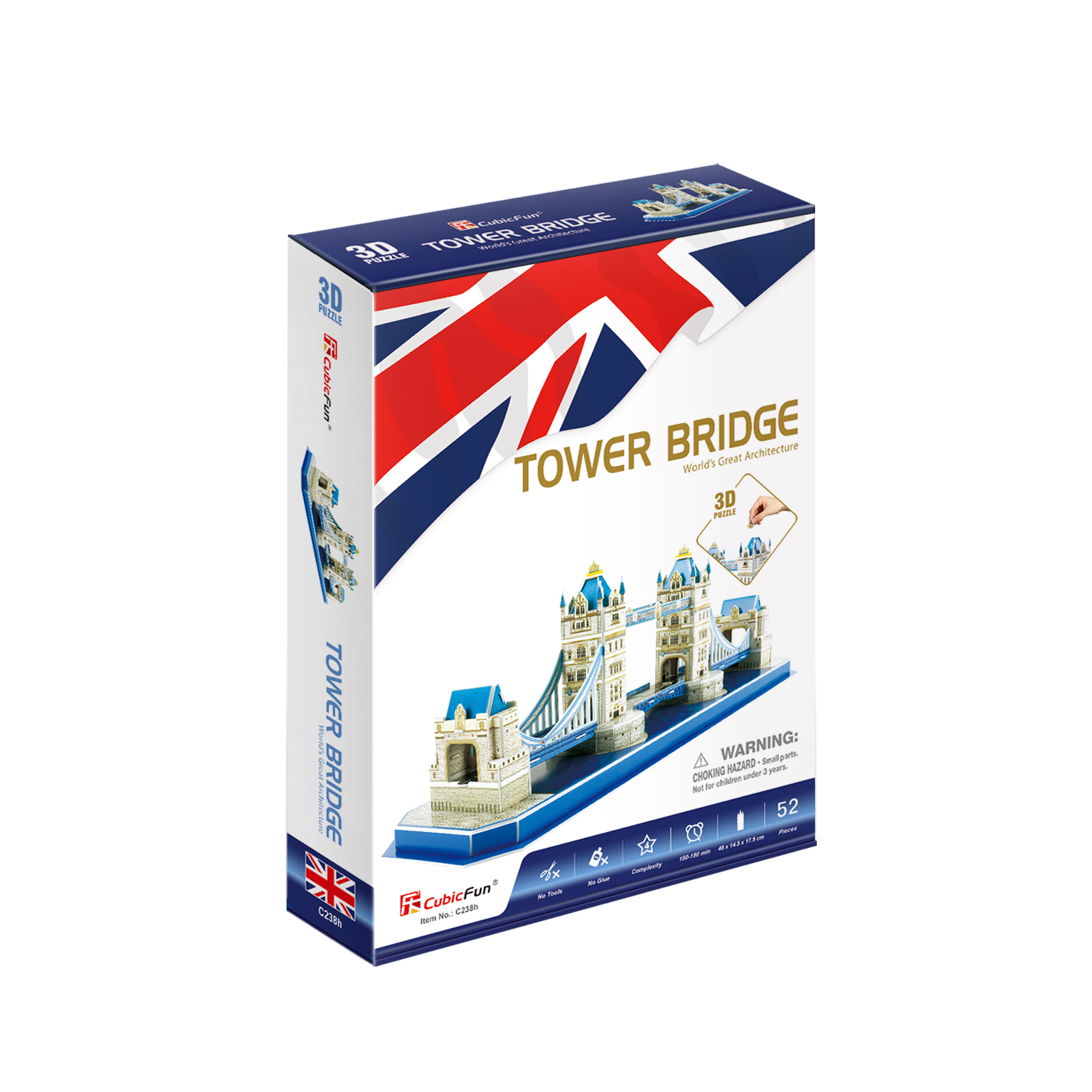 PUZZLE 3D TOWER BRIDGE, to pasjonująca zabawa dla dzieci oraz kolekcjonerów architektury z różnych stron świata. W opakowaniu znajduje się 52 el. puzzli, wykonanych ze specjalnego materiału przypominającego piankę. Puzzle są ponumerowane, ponacinane i umieszczone na arkuszach. Wystarczy bez użycia siły wycisnąć element z arkusza i zmontować go zgodnie z dołączoną instrukcją, bez użycia kleju ani specjalnych narzędzi. Wielkość budowli po złożeniu 48 x 14,5 x 17,5 cm. Zalecany wiek dziecka 3+.