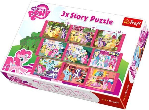 Kucyki Pony - 3x Story PuzzleJeśli lubisz opowiadać historie to polubisz 3x Story Puzzle. Ten wspaniały zestaw dla najmłodszych składa się z 3 puzzlowych historyjek o przygodach Kucyków Pony, z których każda przedstawiona jest za pomocą trzech obrazków. Razem to aż 9 układanek do zabawy zamkniętych w jednym pudełku. Historyjki można dowolnie łączyć i zakańczać, wykorzystując do tego odpowiednią ramkę. Porusz swoją wyobraźnię i stwórz naprawdę długą opowieść. 3x Story Puzzle to wiele możliwości i mnóstwo radości.Układanka jest doskonałym sposobem na ćwiczenie umiejętności logicznego myślenia i pobudzenie kreatywności.