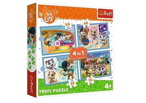 To puzzle dla dzieci składające się z 4 niezależnych układanek, zaprojektowane z myślą o wszystkich fanach i fankach 44 Cats. Po ułożeniu puzzli powstaną cztery obrazki o wymiarach 285 x 200 mm każdy. Zróżnicowana liczba elementów (35, 48, 54, 70) pozwala na zabawę zarówno młodszym, jak i nieco starszym fanom puzzli. Zestaw doskonale spełnia oczekiwania rodzeństwa - każdy ułoży swój ulubiony obrazek nawet w tym samym czasie. Zróżnicowana liczba elementów pozwala na zabawę zarówno młodszym, jak i nieco starszym dzieciom. Do produkcji puzzli użyliśmy materiałów ekologicznych i papieru eliminującego odbijanie światła, co gwarantuje bezpieczeństwo i radość zabawy.
