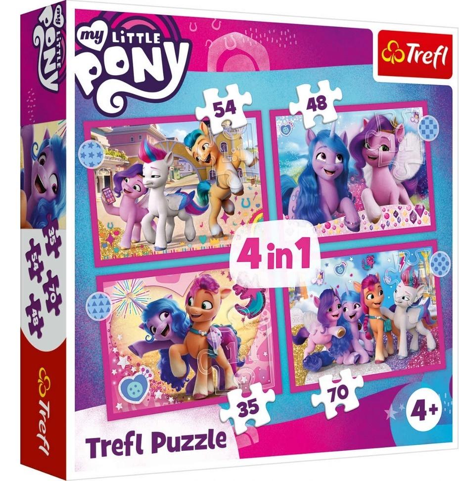Kolorowe Kucyki Pony to puzzle dla dzieci składające się z 4 niezależnych układanek, zaprojektowane z myślą o wszystkich miłośnikach kolorowych kucyków. Po ułożeniu puzzli powstaną cztery obrazki o wymiarach 285 x 205 mm każdy. Zróżnicowana liczba elementów (35, 48, 54, 70) pozwala na zabawę zarówno młodszym, jak i nieco starszym fanom puzzli.